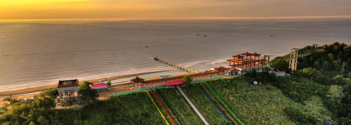 金龙山缆车上山,一面是大海,一面是滑沙滑草+荷园